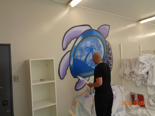 “I thought a nice mural would brighten up those common, concrete walls. We use low-pressure, non-toxic / odour aerosol spray paints. This is great for indoors work and in prison. It’s not your average spray paint but it helps get the job done quickly.”